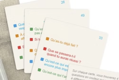 Un jeu simple et efficace, un réservoir de questions puissantes pour mieux aider vos clients à se révéler à eux-mêmes pour mieux atteindre leurs objectifs.