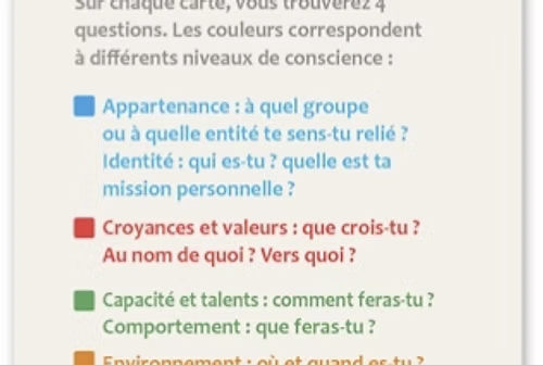 Inspiré des recherches sur les neuro-sciences, le comportement et la gestion du stress, sur les niveaux logiques et la PNL ainsi que de la méthode Kaizen, ce jeu permet d’élargir son point de vue sur une problématique, à un niveau global et systémique.